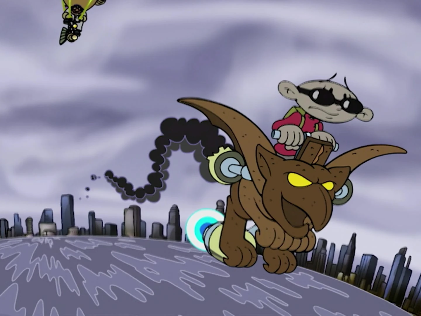 Numbuh 1 flying away from the city in "Operation: U.T.O.P.I.A.".