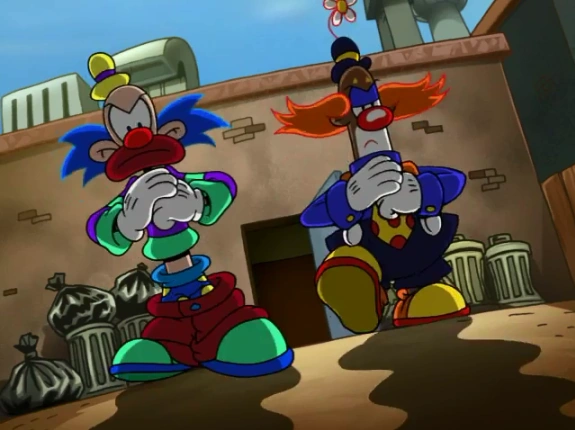 Frankie "Flatfoot" and Bonzo "Baggypants" joined Tony Clownarelli to Gallagher Elementary School in order to put an end to Numbuh 2's jokes. As the clown mafia, they were in charge of the funny business around and did not want anyone else taking part of it. After catching Numbuh 2 joking a second time, Tony Clownarelli sent Frankie and Bonzo to take him out back and cover him with rhubarb pie. Frankie and Bonzo continued to hit Numbuh 2 with rhubarb pies whenever he cracked a joke, until the clowns finally had enough and brought Numbuh 2 before Bunko, the Clownfather. The entire Clownarelli Family chased after Numbuh 2 into the circus tent and cornered him in the ring, but Bunko ordered them to stop when he reunited with his former partner, Dr. Lincoln. They were invited by Dr. Lincoln to come work at Memorial Hospital, which they all accepted and quit the clown business (Operation: C.L.O.W.N.).