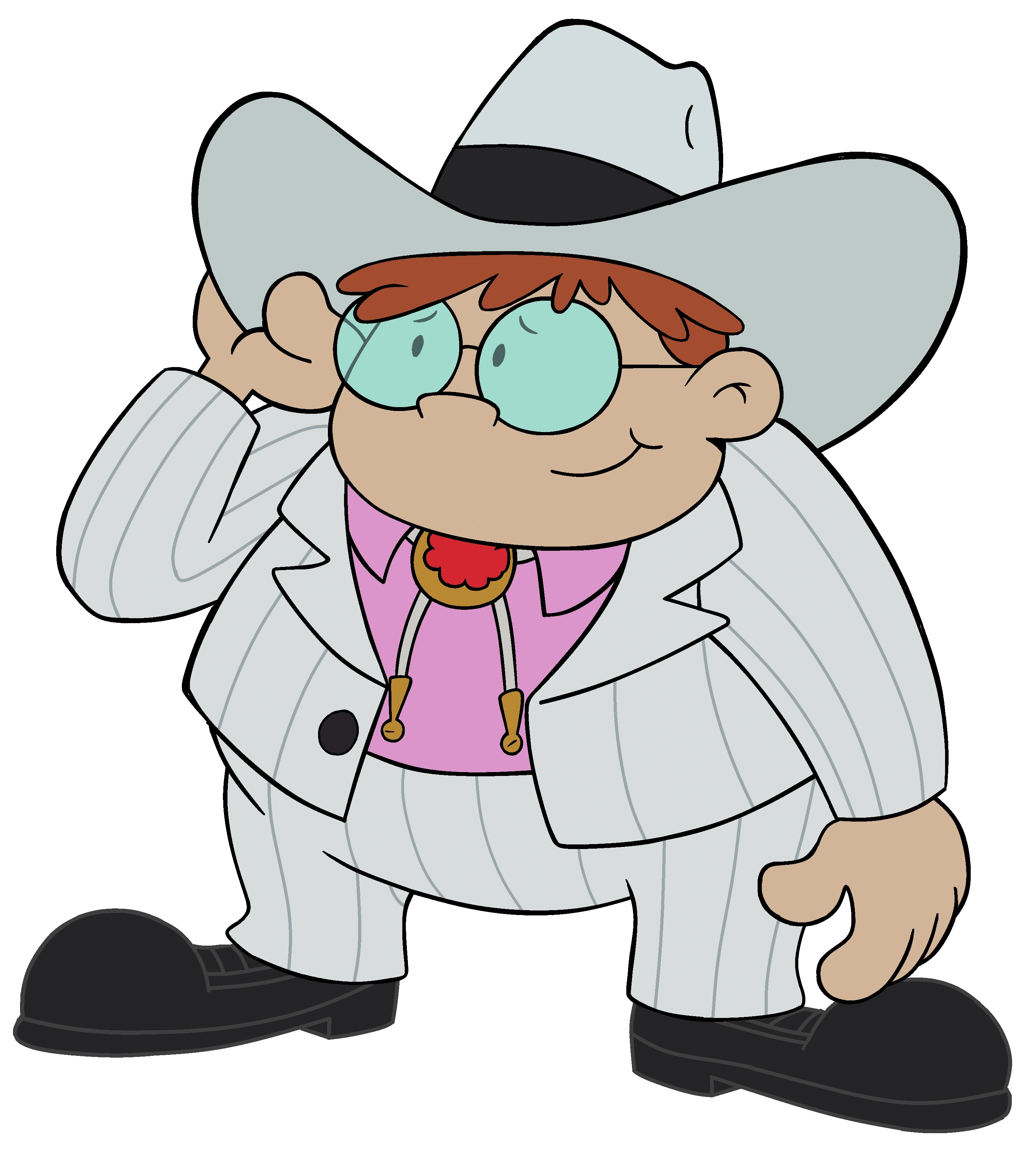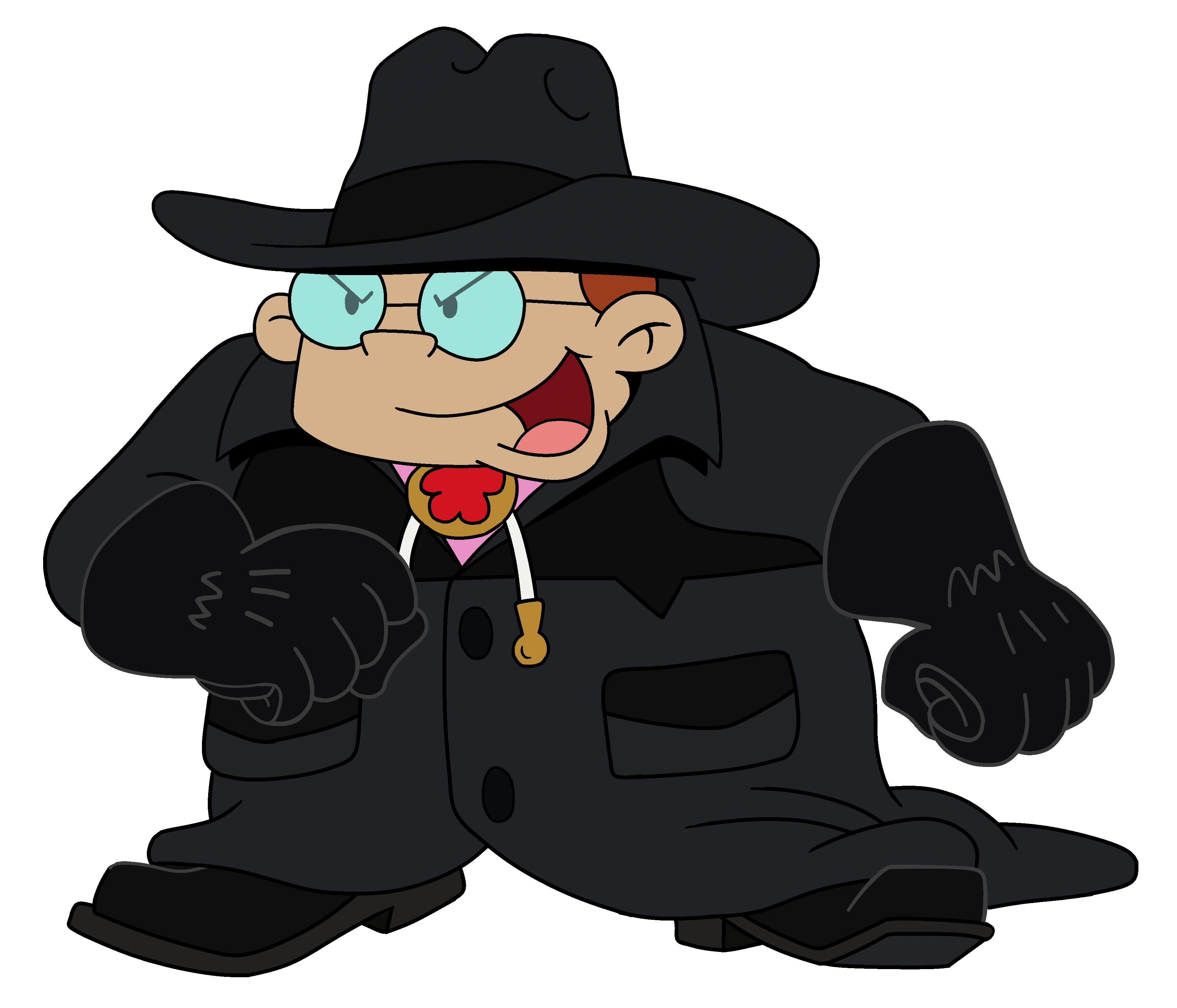 Jimmy is a heavyset boy with curly red hair and large round glasses. For his first appearances he wore a white pinstripe suit and cowboy hat with black dress shoes. After he turned evil he began wearing a long black coat, black leather gloves and a fedora. Both outfits include a pink dress shirt and a bolo tie with a red rosette on its clasp.