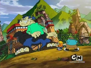 While running through the jungle on the island, Numbuh 2 finds a sheet of unfinished math homework on the ground. With it, he races back to Numbuh 4 and shows the paper to the bully, saying, "Hey, Wedgiesaurus Rex! I did your homework for you!" The bully drops Numbuh 4 and takes the homework from Numbuh 2. Just when it seems like they're off the hook, Jerry cuts in and yells at the bully to attack. All of the bullies on the island proceed to the clearing they are in, and close in on Numbuhs 2 and 4 only to break through the electrified fence in an attempt to get Jerry, who retreats.