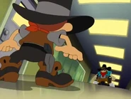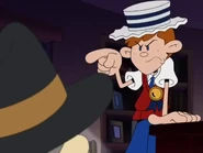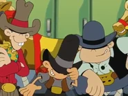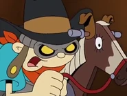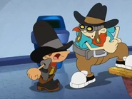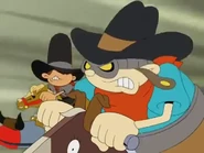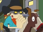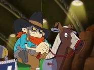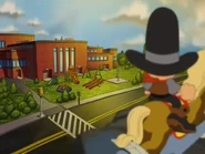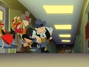 Hoagie makes a stop by the office of student body president Eggbert Eggleston. His assistant Wilson Woodrow gives Hoagie a mission to deliver a vital note to classmate Muffy Jenkins before the end of her lunch period. Hoagie accepts the mission. Immediately upon exiting President Eggleston’s office, he sees Duke, Runt and Lunk of the Six-Gum Gang waiting outside, scouting him as he rides off slowly on Old Rickety. Wilson steps out of the office and whispers something into Runt’s ear, who then orders the Six-Gum Gang to saddle up and ride off.