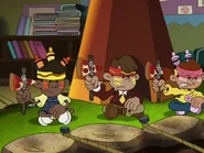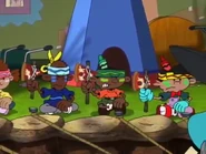 There is sepia footage of Hoagie, Eggbert, and the Kindergarteners signing a peace treaty in the cafeteria, in a room blowing bubbles, in another room pitching a fire and eating cookies, in a gym walking around in a circle, dancing, and then back in the cafeteria, cheering.