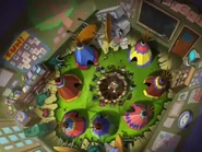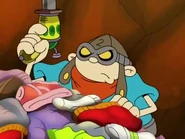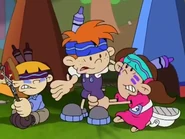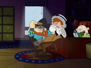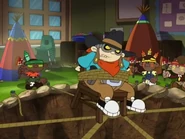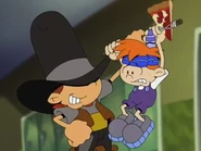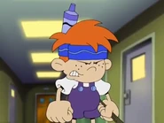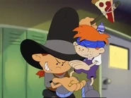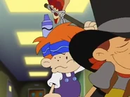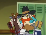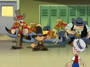 Hoagie, riding on Old Rickety, exits one side of the school and enters the other via a side door. Runt notices from the top of a hill on his rocket horse. Back in the school, Hoagie eagerly speeds down the hallway and to the cafeteria, which is within sight now. As he rides, he wipes out and sees he ran into a toy block blockade, possibly set up by a kindergarten tribe. His suspicions are confirmed when a rogue Sits in Corner jumps on top of him, defying Chief Colors’s orders to leave the big kids alone. Runt intervenes and orders Sits in Corner to hand over his lunch money, threatening him with another atomic wedgie. He gives up his money and is tossed aside by Runt. Hoagie then gets up and warns him to give Sits in Corner his lunch money back. He hovers his hand over his side arm, ready for a showdown. As they both stare each other down, Hoagie reaches for his side arm, but is immediately disarmed by the short-tempered and quick-drawing Six-Gum Gang member’s gum gun. Before Runt can fire another shot, Sits in Corner bashes him over the head with his pizza axe, knocking him out cold. He tells Hoagie that not all fourth graders are bad, and even allows him to keep his lunch money. They go their separate ways.