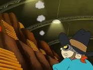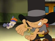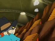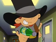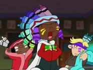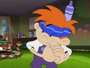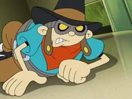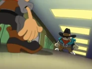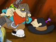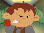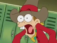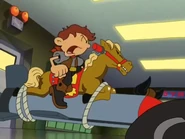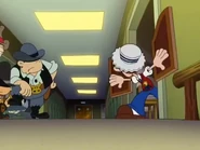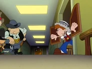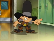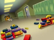 Moments later, the Six-Gum Gang turns the corner and gives chase to Hoagie. As Runt orders him to pull over, he notices Duke using his rocket horse to create a blockade for Hoagie, who jumps over him with Old Rickety. The three Six-Gum Gang members continue chasing Hoagie, who sends homework papers flying into the pathway of the gang members, distracting them momentarily. Duke and Lunk crash their rocket horses into the lockers while Runt narrowly avoids the pile-up to keep pursuing Hoagie. He gets the idea to lose Runt in the gymnasium, where apparently, people who go in don’t “make it out of there alive.”