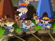 When Hoagie wakes up, he’s restrained with ropes in a chair, in a classroom, and surrounded by members of the kindergarten Crayoned Tribe. Below him is a bottomless abyss; several ropes hold his chair in place from falling. The kindergarteners are playing a game of Duck, Duck, Goose, led by Sits in Corner, and each time one of the kids gets goose, they use an axe with a slice of pizza for a blade to cut one of the ropes keeping Hoagie from falling into the wormhole. A fellow kindergartener, Gets Pigtails Pulled, runs in to stop Sits in Corner from dropping Hoagie into the hole. Before the game can continue, Chief Colors with Broken Crayons, the leader of the kindergarten tribe, enters the classroom to put a stop to everything. It’s revealed by Chief Colors that Sits in Corner was given an atomic wedgie by fourth graders long ago, making his predicament with Hoagie a personal one, since he is a fourth grader. Chief Colors orders two of the tribe members, Mother Dresses Funny and Still Wets Pants, to release Hoagie from captivity.