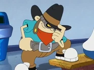 Hoagie and Old Rickety ride around slowly through the gymnasium. The place looks completely deserted, but Hoagie knows not to let his guard down, for there might be troublemakers looking to ambush him. As he notices puffs of smoke in the distance (which turn out to be kids clapping erasers), an unseen foe shoots a dart at Hoagie’s cowboy hat. He immediately dives for cover. Soon after, he gets up to look around, and seeing that the coast might be clear, retrieves his hat. Just then, he’s tackled by a kindergartener and blacks out.