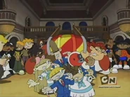 While this is happening, Cree drags Maurice to the basement of the mansion, looking for Father's "inner sanctum," and along the way, Numbuhs 2 and 5 spot them. Numbuh 5, figuring that her sister's probably up to something, goes on to see what she could be up to, while Numbuh 2 stays behind by the sprinkler system. And while this is happening, Numbuhs 3 and 4 are making their way to the kitchen. Along the way, they stumble upon a roomful of slow-dancing teen couples. Numbuh 3 comes up with the idea of her and Numbuh 4 slow dancing their way across the room. Numbuh 4 felt a little embarrassed by the dancing and music and he nearly threw up but they managed to get through. And once they notice that they room they got into is the kitchen, they get started on cooking up all the instant mashed potatoes.