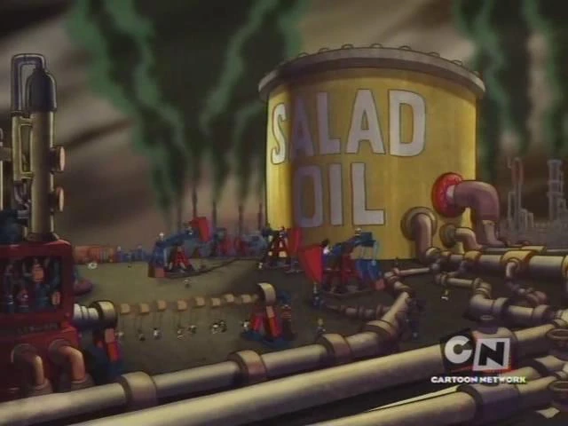 In the next scene, a class is dismissed, but the students beg to the teacher to let them stay in class and learn random things rather than going out for recess. Forced to leave the classroom, they go outside to show a factory-like playground, where the students make salad oil when they use it.
