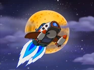 In the sky, Numbuh 3 saw other beams of light shining down into the town, taking all the other Rainbow Monkeys from the kids. She loses her grip and falls to her certain doom until her teammates recues her in a S.P.A.C.E.R.C.H.A.S.E.R. and pursues the toy. Numbuh 2 gives the vehicle more throttle due to the toy flying away at the speed of light where the pursue bypasses the Moonbase. As they were pursing the Rainbow Monkey, Numbuh 4 powers up the clamp while Numbuh 5 gets a perfect aiming shot at the toy. Once the targeting was locked, Numbuh 4 activates the clamp, only for the machine to start suddenly losing power in the pursuit and lost the Rainbow Monkey.