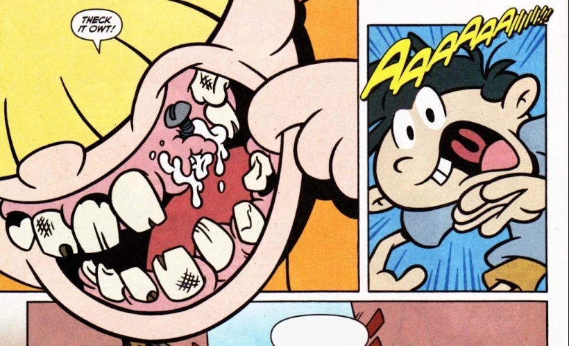 Numbuh 2 and Numbuh 4 are hiding in an alley, waiting for someone to arrive. A second-grader comes over and asks Numbuh 4 a question, but Numbuh 4 interrupts by telling the boy to pay fifty cents. The boy pays, and Numbuh 4 shows him his gross-looking teeth, one of them being held in place by glue and a nail. The sight of it is so disgusting that it scares the boy away. Numbuh 4 chuckles and says that second graders will pay anything to see his lucky tooth, which is his last baby tooth that he has been holding together since he was six years old.